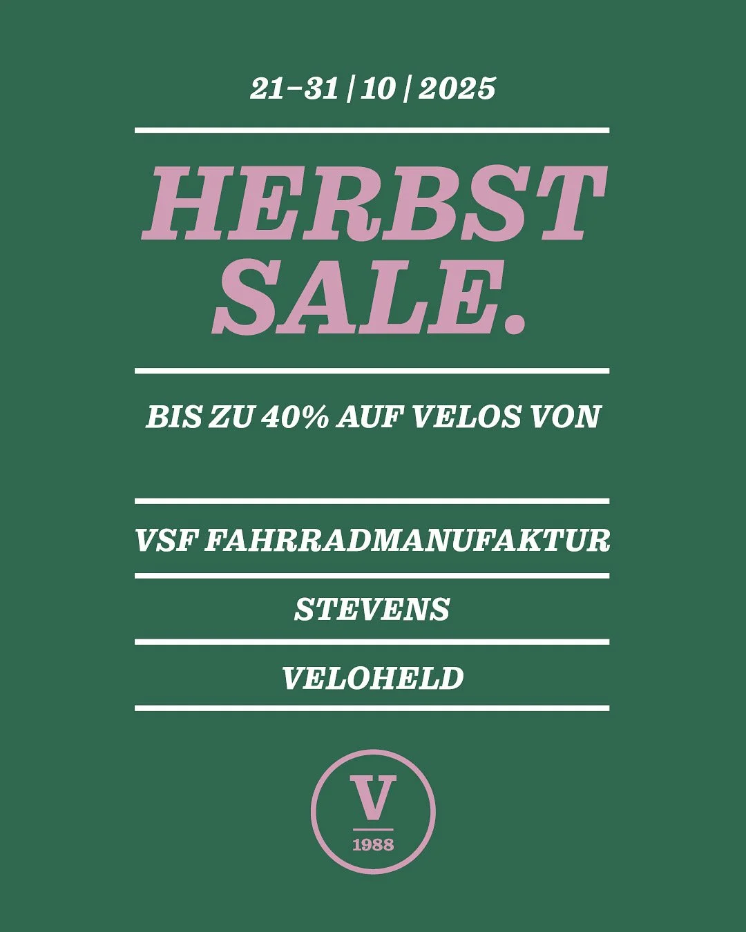 Im Zeitraum vom 21.-31.10.2025 sind bei uns Velos von VSF Fahrradmanufaktur, Stevens und Veloheld um bis zu 40% reduziert. Kommt vorbei!